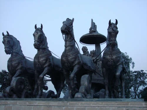Мы начали медленно двигаться по территории первого проявления Брамы, (вокруг озера Брахмасаровар), и Марина Филиппова рассказывала нам о великой битве пандавов с коуравами, о разговоре Арджуны с Кришной.