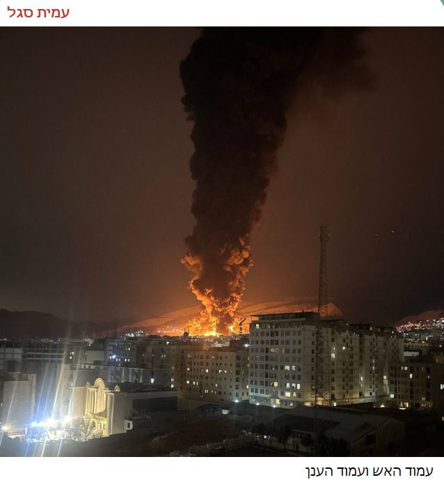 В качестве картинки - фотография из телеграм-канала Амита Сегаля - горящий нефтяной склад/завод в Тегеране. Под фотографией написано: столп огненный и столп облачный - отсылка к Танаху. Эти столпы вели евреев через пустыню к Земле обетованной.