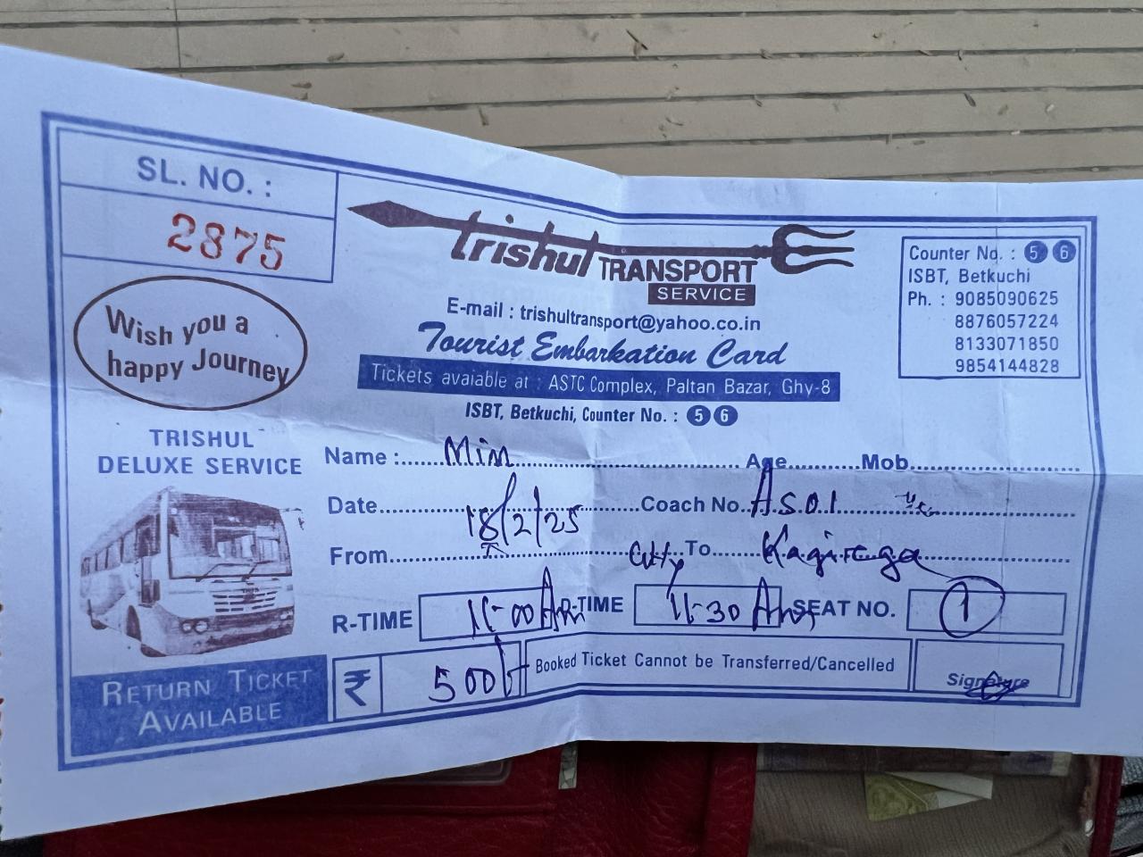 Я путешествовала по Ассаму на автобусах. В Казирангу приехала из Гувахати: а день до отправления за 500 рупий в автобусной кассе Inter State Bus terminal купила себе билет с фиксированным местом.