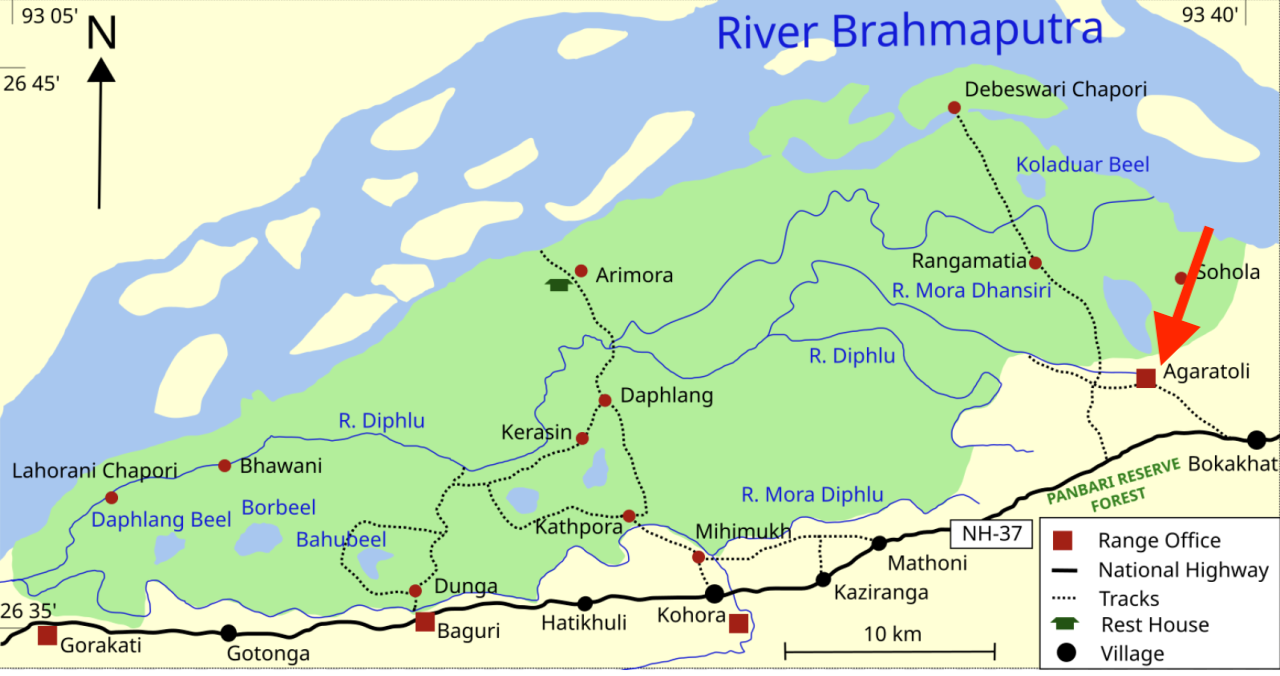 Бхуморагури: Эта точка находится на другом берегу Брахмапутры, неподалеку от города Тезпур, под мостом Колиабхумура. Это самый популярный и самый раскрученный старт для речного сафари.