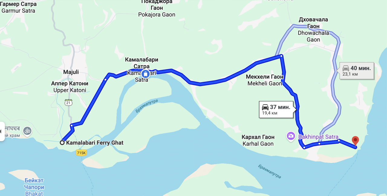 На острове есть две паромные переправы: Афаламук Гхар (Aphalamukh Ghar) и Камалбари Гхар (Kamalbury). Первый паром на Маджули отправляется в 7:30 AM, а последний аж ночью: в 4:00, весь путь до Афламукха занимает около часа, до Камалбари больше: на подходах к причалу низкая вода.