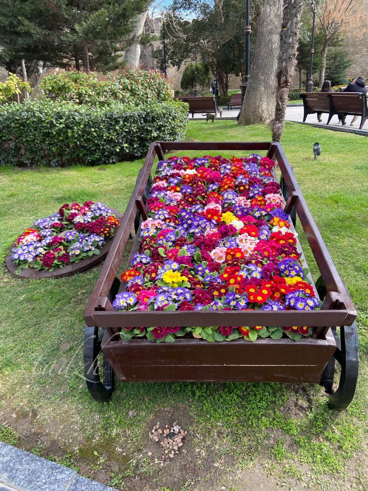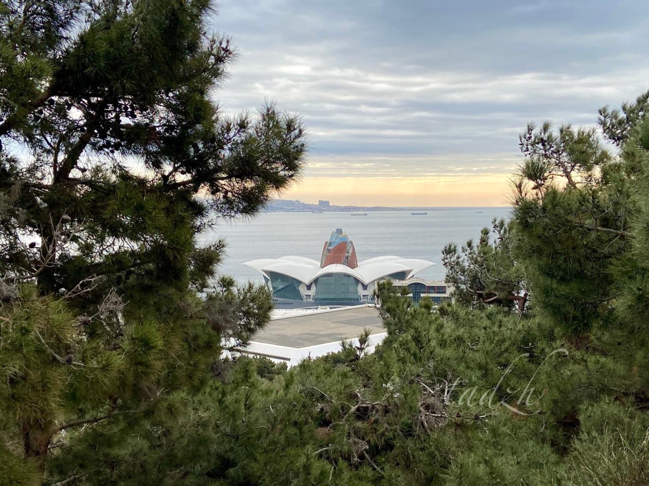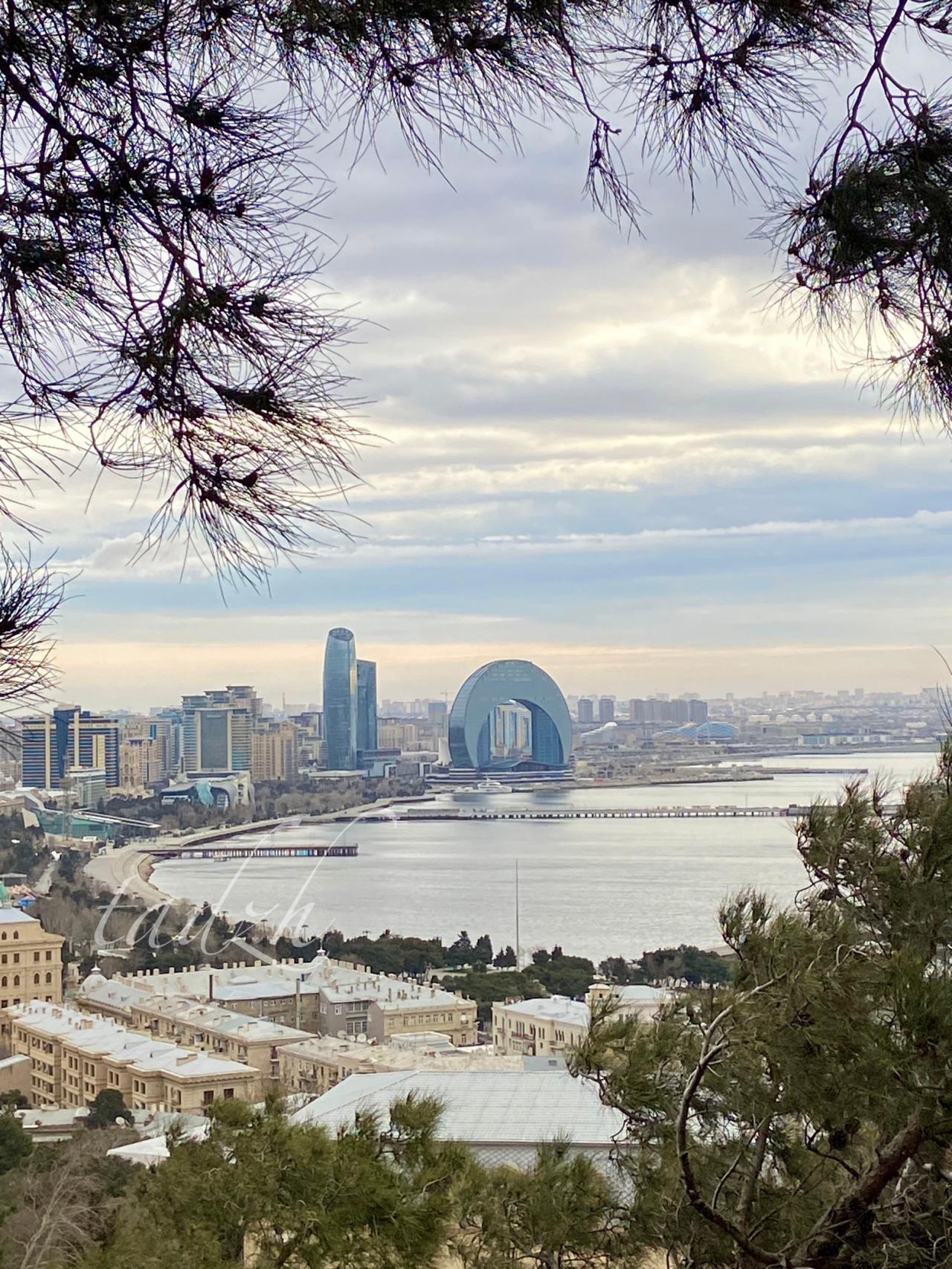 С горы открываются прекрасные виды на город. Там есть обзорные площадки, можно погулять по дорожкам среди хвойных лесов. Вообще, хвойные растения преобладают в Баку. Иногда даже хочется чего-то разрежающего эту однотонную зелень. Возможно, природа ещё просто просыпается, и все яркие краски будут позже, хотя кое-где клумбы уже пестрят примулами, декоративной капустой и ранункулюсами :).
