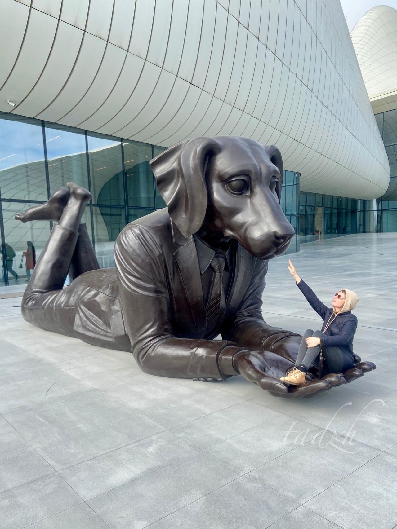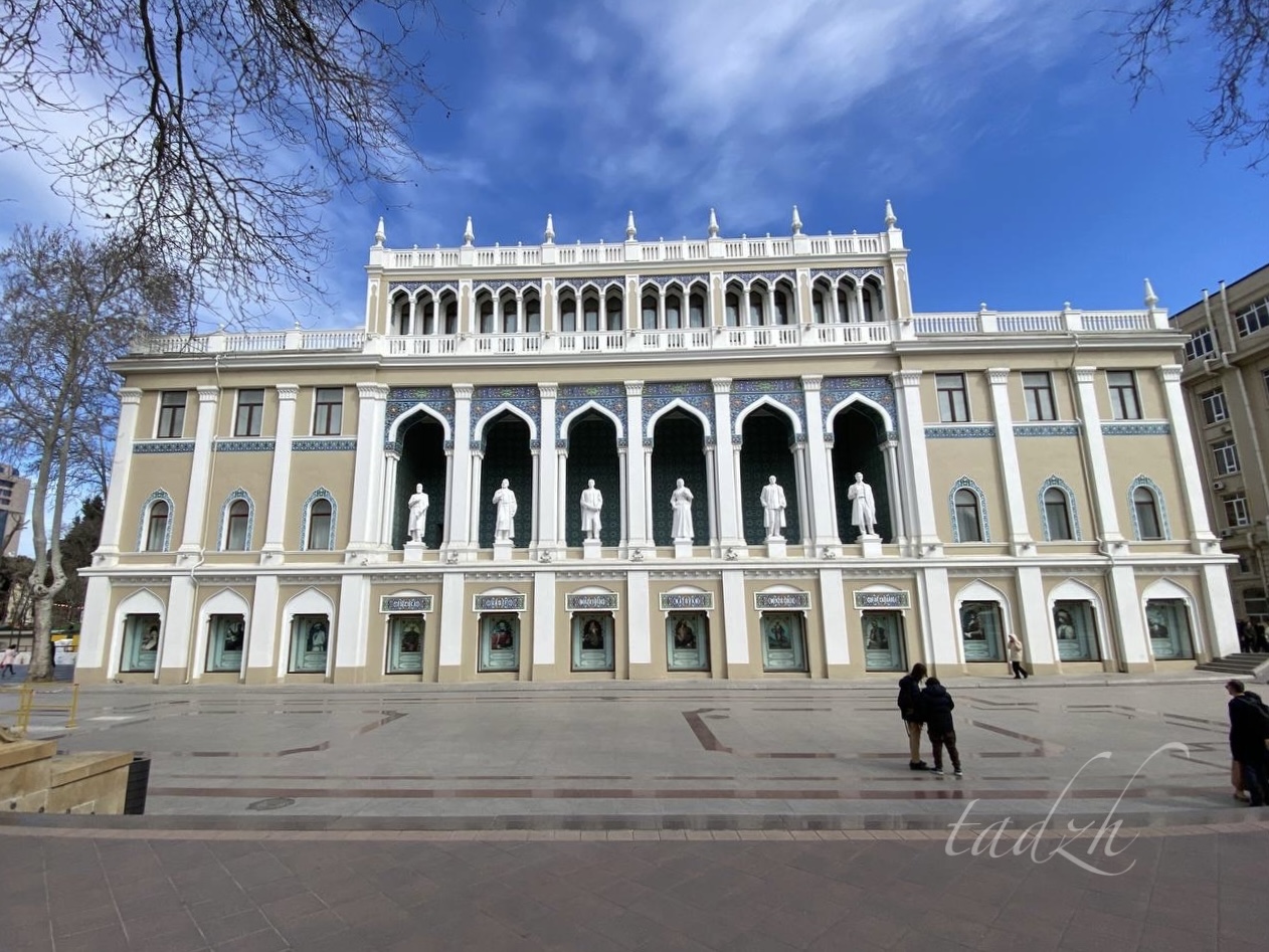 Чтобы к нему подобраться поближе, нужно снова спуститься в метро и доехать до станции "Нариман Нариманов", а затем пройти пешком несколько кварталов. И вот здесь с нами случился небольшой казус: при выходе из метро это здание, построенное в постмодернистском стиле, не видно, поэтому нужно или включать навигатор, или использовать местное население. Мы предпочли второй вариант, экономя заряд батареи, и только с третьего раза нам указали верное направление (это к тому, что у женщин в Баку лучше дорогу не спрашивать). Зато мы познакомились с веселым азербайджанцем, который и анекдот рассказал на камеру, и сопроводил нас большую часть пути. :)