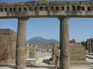 На следующий день после Неаполя у нас едем Помпеи. Едем опять на электричке до станции Pompei Scavi. По дороге обсуждаем Везувий, рядом со мной сидела итальянка, она сообщила нам, что он спит и мы можем отдыхать спокойно. Развалины видно уже с платформы. Мы поехали рано, в 9 были уже на месте, туристы были, но не так как часов в 12, что яблоку упасть негде. Согласно истории, Помпеи был основан еще в VIII в. до н.э. и перестал существовать 24 августа 79 г. н.э. Он был разрушен каменными бомбами, вылетавшими из жерла вулкана, засыпан вулканическим пеплом, залит горячим дождем, он то и сцементировал все эти вулканические выбросы. Сила извержения была такова, что пепел от него долетел даже до Египет и Сирии. С 20 000 жителей Помпей в зданиях и на улицах погибло около 2000 человек. Большинство жителей покинули город еще до извержения. Руины Помпей были случайно обнаружены еще в конце XVI века, но масштабно начали копать в 1748 и копают до сих пор. Город был богатым, в центре было 2 публичных дома, термы - бани, нижние и верхние, был театр, форум, крытый рынок и базилика.