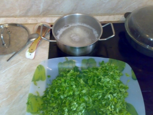 ДОВГА - КИСЛОМОЛОЧНЫЙ СУПЧИК С ЗЕЛЕНЬЮ Для начала научимся правильно произносить название. Не "давга", а именно "довгА", с четким О и ударением на последний слог. Потом попробуем, как белорусы, вместо В произнести короткое У, почти съедая этот звук, а затем, как украинцы, произнести букву Г. Получилось? Тогда самое сложное позади, приготовить довгу гораздо проще... Для начала соберем необходимые продукты (все на фото 1): 1) 4 пучка кинзы + 4 пучка сельдерея листового + 1 пучок укропа (это - необходимый минимум). Не пытайтесь добавлять зеленый лучок, или базилик, или тархун - очень пряно получится. Пожалуй, немного мяты я бы добавил, но под рукой не оказалось. Азербайджанцы добавляют еще массу невиданной здесь, в средней полосе, зелени, про которую вы, скорее всего, даже не слышали: горную кинзу, кявяр, портулак... Но это - вариации на тему. Основное - сельдерей, кинза и укроп. 2) около 2 л мацони. Мы заквашиваем сами. Замена - живой йогурт, катык (иногда в продаже встречается), на худой конец - смесь кефира и сметаны в пропорции 4:1 (так чтоб и не слишком кисло, и не слишком жирно было). 3) 2 столовые ложки с горкой риса. 4) 2 столовые ложки муки. 5) одно яйцо. 6) соль 7) 600 г воды Еще понадобятся две кастрюли, на 1,5 литра и на 5 л, миксер или блендер, нож, разделочная доска и длинная деревянная ложка. Все. Ставите рис вариться в маленькой кастрюльке в 600 мл воды, а тем временем мелко рубите мытую и подсушенную салфеткой зелень. Когда рис дошел до полуготовности - закидываем туда же зелень и чайную ложку соли. Еще варим до мягкости зелени. (фото 2) Тем временем в большую кастрюлю на дно высыпаем 2 столовые ложки муки, разбиваем яйцо, немного мацони - и тщательно вымешиваем миксером, постепенно добавляя мацони. Это необходимо, чтобы дальше, при нагреве, мацони не свернулось бы. Раньше хозяйки и без миксера справлялись, просто венчиком или даже ложкой вымешивали (деревянной - лучше!) При постоянном перемешивании переливаем содержимое маленькой кастрюльки в большую, и ставим на большой огонь, интенсивно мешая деревянной ложкой (фото 3). Когда закипит - немедленно снимаем с огня. Можно видеть, что зелень в довге слегка поменяла цвет (фото 4). Оставляем остывать без крышки (а то конденсат поверх супчика накапает. Дальше - в холодильник. Довгу употреблять холодной! Весь процесс готовки у меня занял минут 40, при этом я не спешил и фотографировал. Это летний вариант довги. А если в маленькой кастрюльке варить горох нут, потом мелкие мясные фрикадельки, и только потом уже рис и зелень, то это будет зимний вариант, и такую довгу уже едят горячей. Приятного аппетита, друзья!