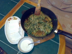 В-третьих, жарить надо обязательно на сливочном (обычном, или топленом) масле. Сто раз я пытался нарушить это правило, и пожарить кюкю на разных видах растительных масел - ничего лучше сливочного для этого блюда нет! И жарить надо так: разогреть масло на сухой сковороде, пока оно скворчать не перестанет, затем влить яично-зеленную смесь и закрыть крышкой! После того, как над зеленью подымутся омлетные "хлопья", а сок выпарится настолько, что будет слышно уже не бульканье, а скворчанье, - переверните омлет и поджарьте с другой стороны.