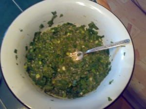 Во-вторых, яиц не должно быть много, и не должно быть мало. Добавлять яйца в зелень нужно до той поры, чтобы получилась приблизительно вот такая консистенция, как на первом фото. Не нужно, чтобы зелень плавала в яичной смеси, но и гора зелени, слегка смоченная яйцом - тоже нехорошо. Посолите, поперчите черным перцем, добавьте толченого кориандра - и еще раз как следует взболтайте.
