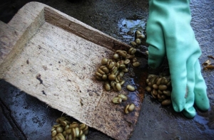 После сбора сотрудник готовит кофейные зерна, промывая их водой