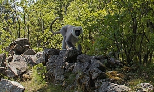 Однако на обратном пути меня ждало небольшое приключение: прямо на тропе, вокруг тропы, над тропой расположилась большая стая крупных белых лангуров. Они тяжело прыгали по деревьям, бегали по лесу, своим размером напоминая собак крупной породы. А главное - они сидели прямо на моей дороге! Я бы их обошла, но идти было некуда, они были повсюду.