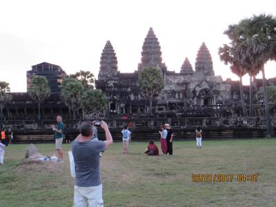 Затемно рикша нас повез за билетами и встречать рассвет. По дороге часто обгоняли велосипедистов. Взяли на заметку. К Ангкор Ват приехали задолго до рассвета, но народу уже было много. Рассвет не впечатлил (закат круче). По советам бывалых задерживаться после рассвета в Ангкоре не стали, решили оставить на конец круга.