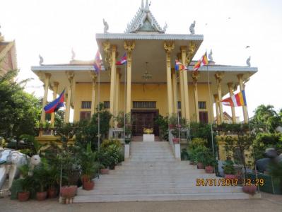 Заселились и пошли гулять. Подготовка к Новому году вовсю шла и в Сиемрипе. Те же красные фонарики, что и во Вьетнаме, цветущие деревья. Набрели на храм, там явно шли приготовления к празднику, все украшалось цветами, подметалось.