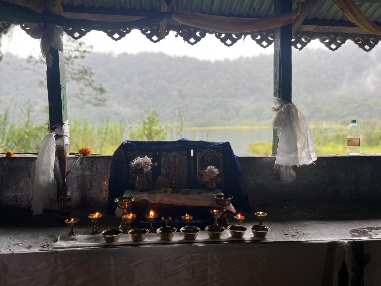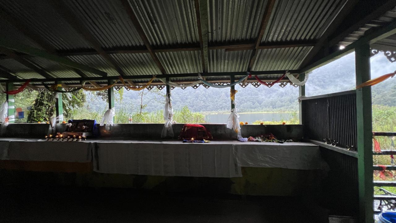 Довольно быстро вы окажетесь на небольшой набережной, хотя слово "набережная" тут не совсем уместно. Скорее всего это небольшое расчищенное пространство со скромным святилищем под навесом, где вы можете попросить Озеро об исполнении своего самого сокровенного желания: ведь название озера переводится как "исполняющее желание". Снимите обувь, пройдите в павильон и обратитесь к Таре Деви со своей просьбой.