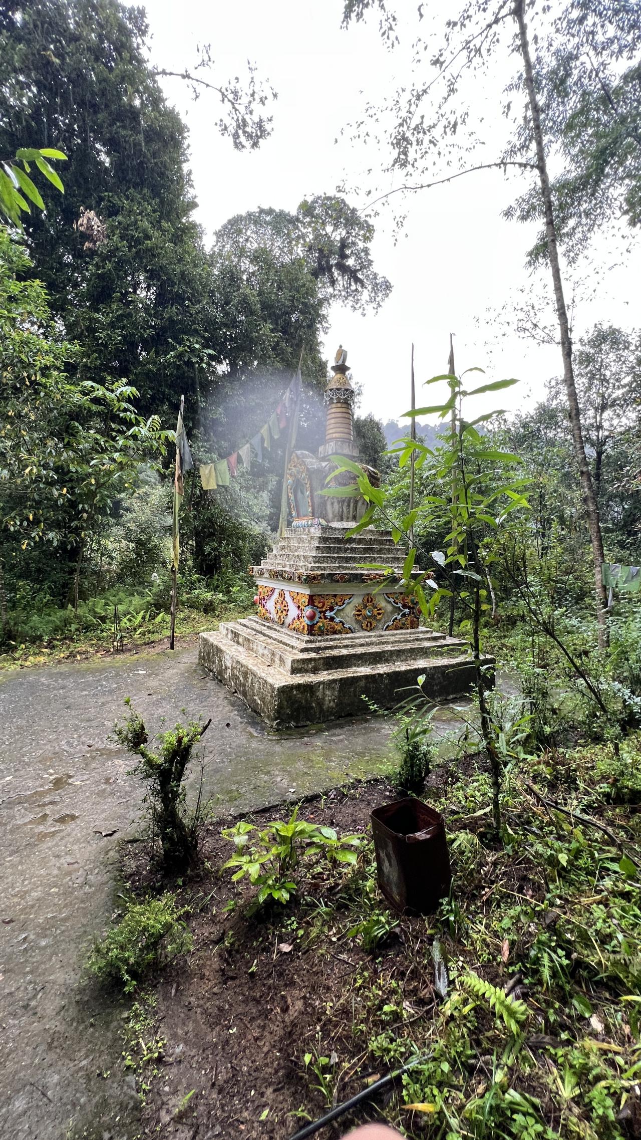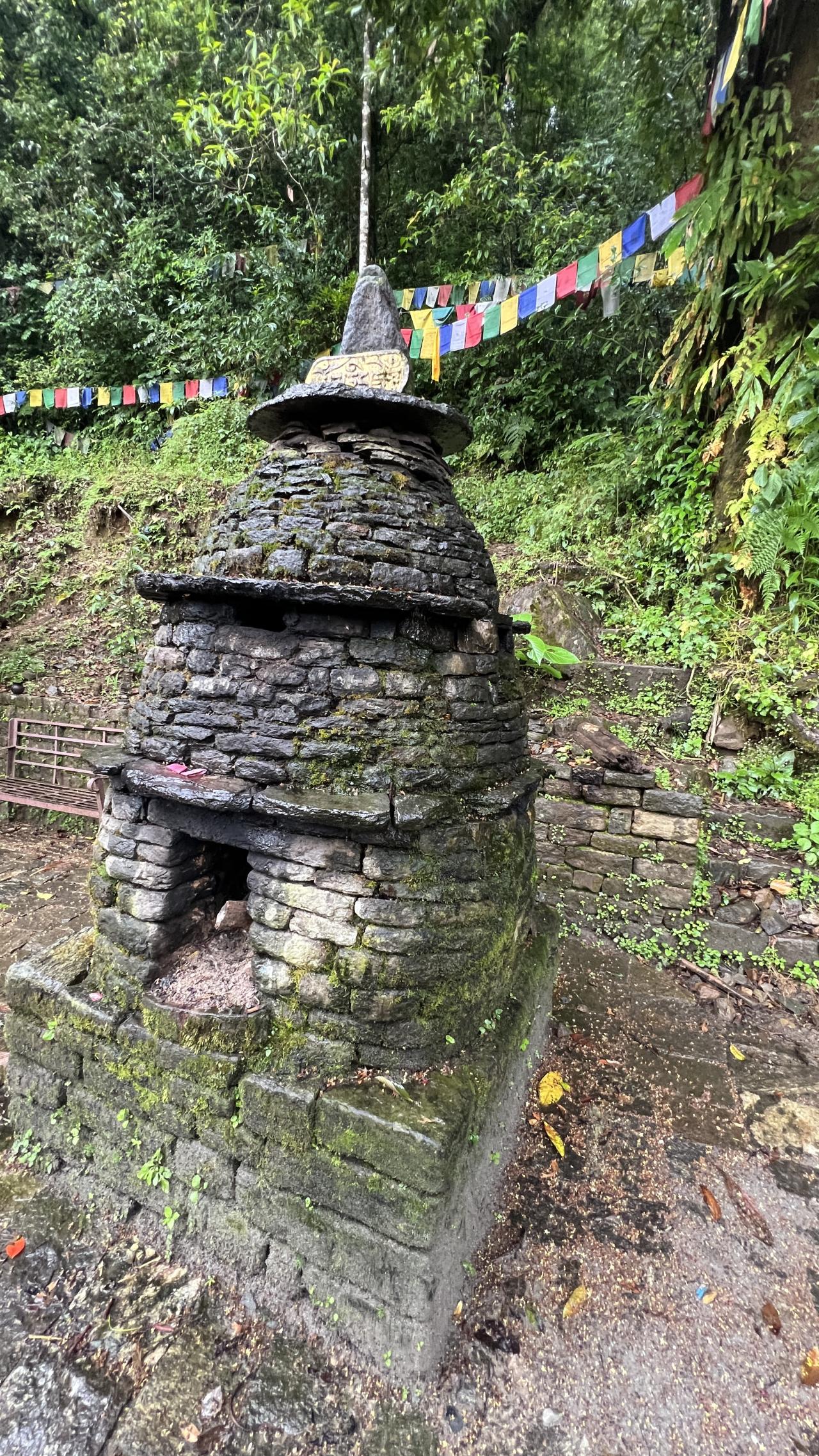 Вниз к монастырю можно пройти другой дорогой. Она положе, вьется между ступ и чортенов, проведет вас мимо простенького хоумстея (единственного жилья тут, кроме гостиницы при монастыре), мимо второго входа в пещеру Гуру Ринпоче, а потом выведет к монастырю — с тыльной его стороны