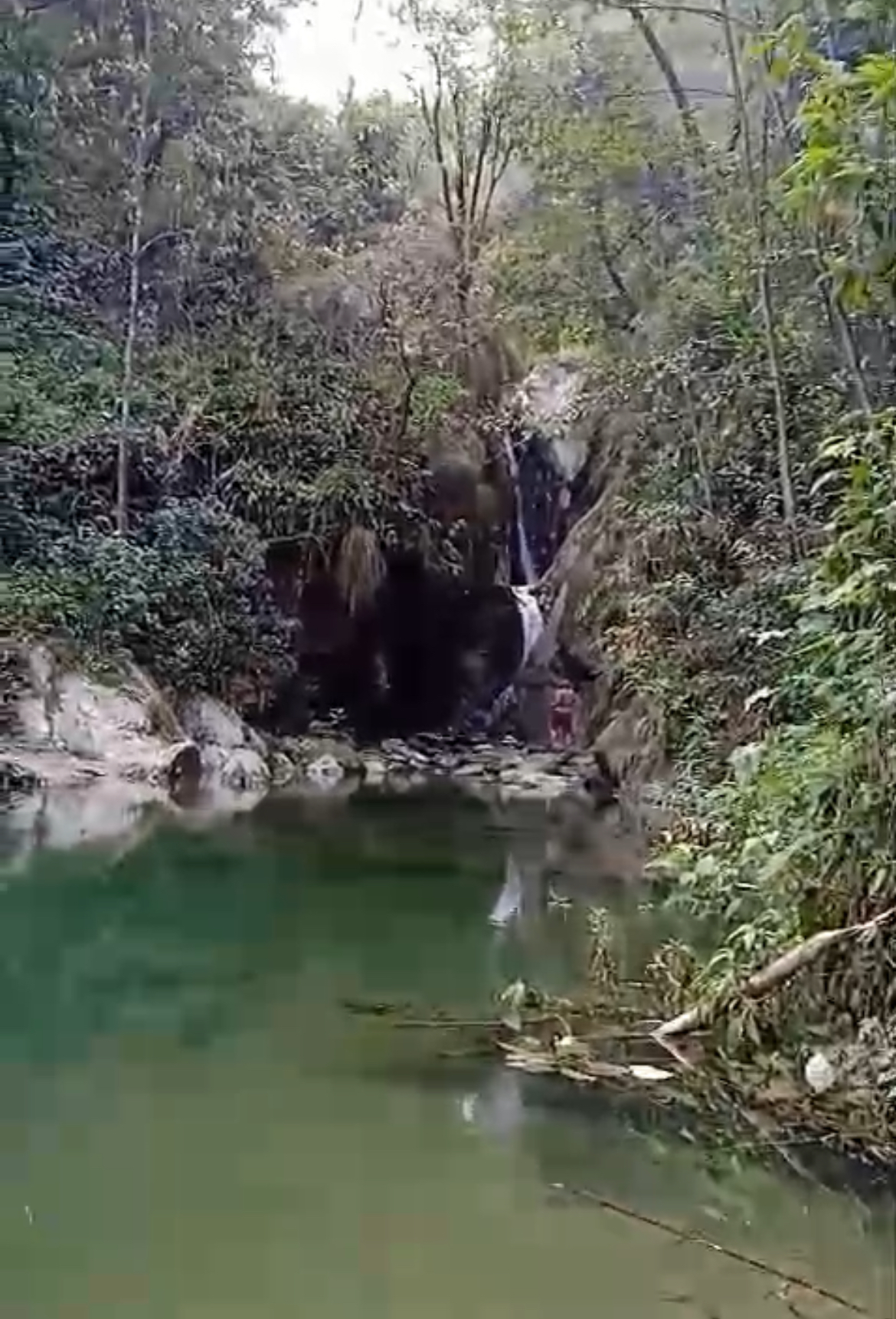По звуку там дальше был еще один, я пошла проверять по колено в воде и точно: в маленькой замкнутой камерной пещере ступенями ниспадал второй водопад, который ниоткуда не видно. Этот каскадный водопадик образовал в пещере изумрудное озерцо с чистейшей водой.
