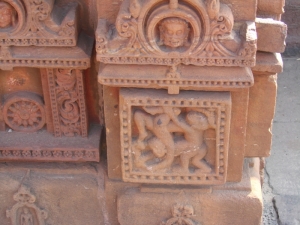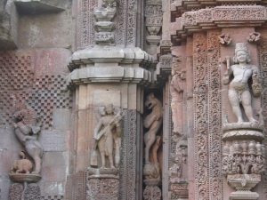 Муктешвар открывется своими сказочными воротами, а затем и центральным входом на восток. Храмовое мурти находится на месте, о чём вам сигнализирует флаг. Но можно зайти внутрь, позвонить в колокол, посидеть под венчающим потолок джаганмохана гигантским каменным лотосом и подождать нисхождения Божественной Благодати. А потом обойти храм и полюбоваться на чудесные каменные изваяния, устремляясь к храмовому прудику с красными рыбами...