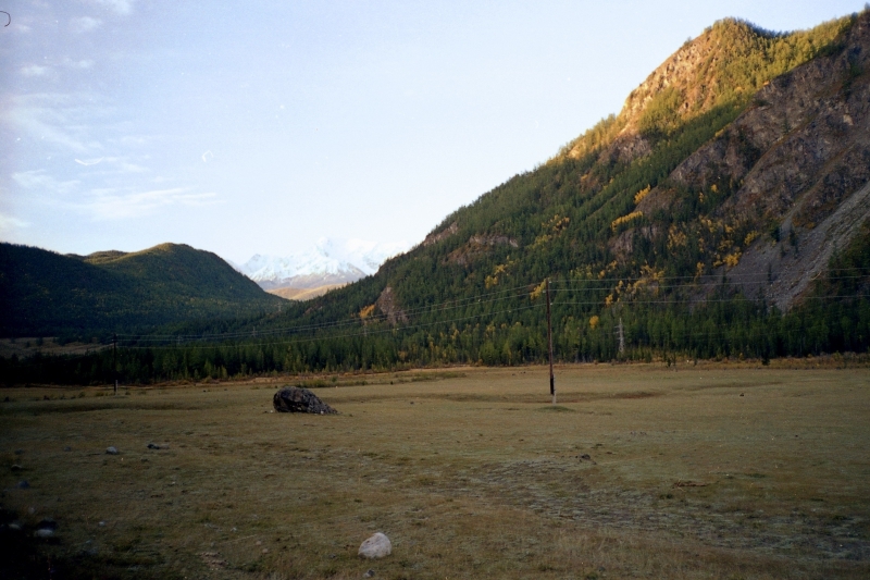 Пейзажи по дороге настолько потрясающие, что только люди с тонкой душевной организацией способны их описывать. Среди авторов этого сайта такие встречаются, и я к их таланту пронзительную зависть испытываю (даже не знаю, черную или белую). Они увидят травинку проросшую сквозь асфальт и давай описывать! Страницы на полторы... А уж такое то буйство природы!.. Остальным же читателям, которых, как и меня, Бог этим даром обделил, желаю увидеть этот восторг наяву. А кто уже видал – увидеть еще раз. Как слабое напоминание об увиденном, привожу одну из фоток, где вдали виднеется заснеженная вершина г. Белухи. Впечатление немного портит всеобщая электрификация, которая, согласно известной ленинской формуле, есть коммунизм минус советская власть... Ничего, скоро я десять дней ни проводов, ни асфальта не увижу...