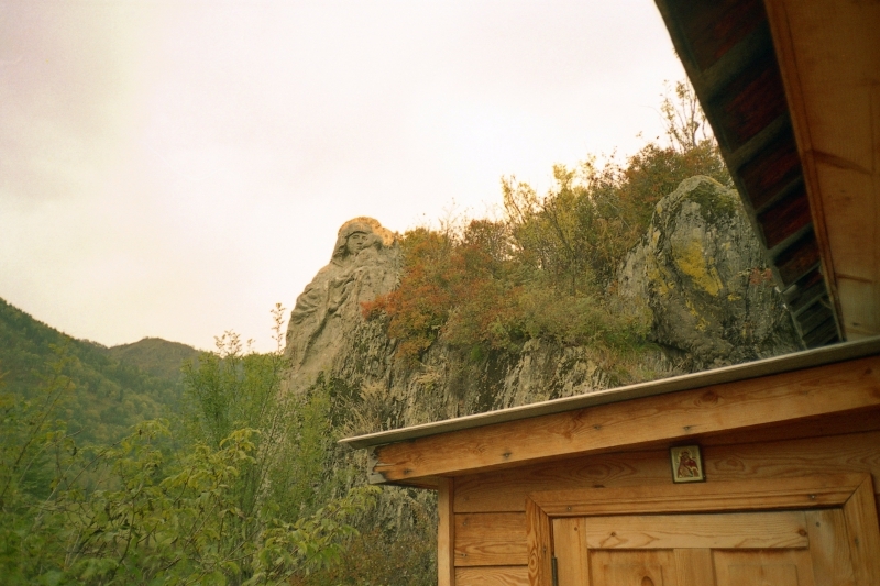 Там некоторое время жила одна послушница, в миру бывшая скульптором. И она потихоньку стесала скальный выступ в виде скульптуры богоматери с младенцем (фото 3). Без альпинистского снаряжения, между прочим, только с зубилом и молоточком!