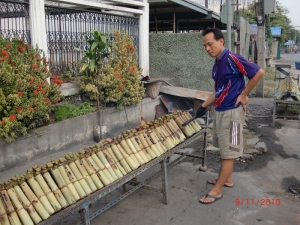 Тайский десерт Као Лам Као Лам с тайского означает дословно «запечённый рис с кокосовым молоком». Такое блюдо очень дешёвое и является ходовым среди тайцев. Принцип приготовления Као Лам предельно прост и экономичен. В бамбуковый пустой стебель закладывают рис и заливают его сверху кокосовым молоком. Сверху рис затыкается пучком травы, а бамбуковая палка ставится печься на угли. Проходит несколько минут и Као Лам полностью готов к употреблению. Во время приготовления рис становится распаренным, полностью пропитанным кокосовым молоком, вкус приятно сладкий, но не приторный. В Камбодже, например, в рис для контрастности добавляют красные бобы, по вкусу они становятся как изюм. Как есть Као Лам? Всё просто: бамбуковую трубку аккуратно разделать, как шкурку банана. Бамбуком же можно и есть рис, можно и руками. У уличных торговцев могут быть и ложечки.
