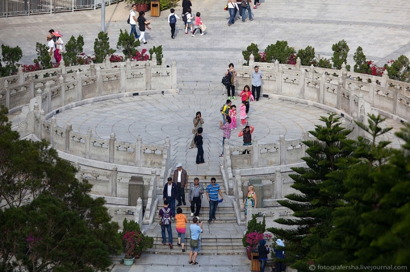 С площадки у подножья статуи открывается прекрасный вид на Южно-Китайское море и остров Лантау. Внутри постамента находится небольшой храм (за отдельную плату), включающий три отделения: Зал Вселенной, Зал Заслуг и Зал Памяти. И здесь же можно лицезреть святейшую реликвию буддистов — останки земного Будды — Сиддхартхи Гаутамы. Согласно поверью, тело основателя религии было сожжено, пепел поделили на 84 тысячи равных частей. Горстки отправлялись в разные страны, разным народностям, чтобы у всех была частичка великого творца.