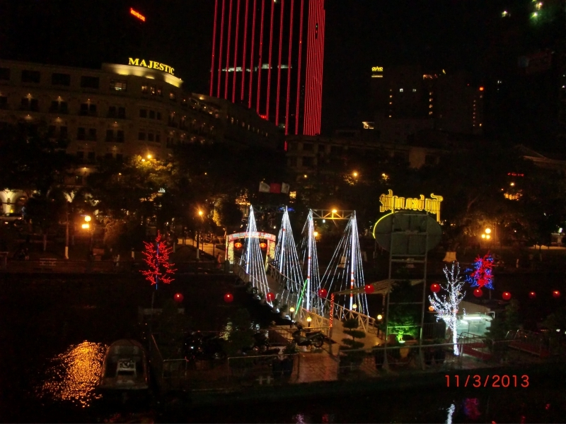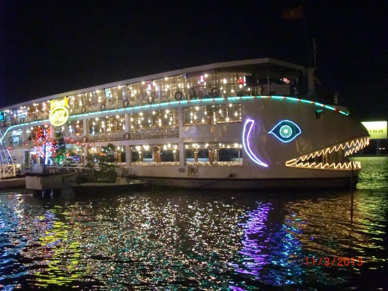 Найти эти кораблики достаточно просто. Нужно идти по бульвару Nguyen Hue, пока не упретесь в реку. Там сразу видно эти корабли. Еще ориентир - отель Magestic. Плавучих ресторанов несколько, мы выбрали самый красивый. На каждой палубе играет своя музыка, вход бесплатный, платишь только за ужин. Еда – порции большие, но не особо вкусно. Играет музыка, кораблик отчаливает, катает около часа и возвращает откуда взял. Самое красивое место – это у причала. Потом темно, огоньков нет и если бы не еда и концертная программа (караоке, файершоу), то не понятно что ты вообще делаешь на этом корабле.