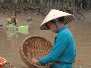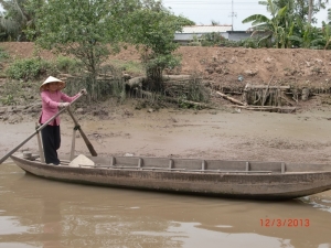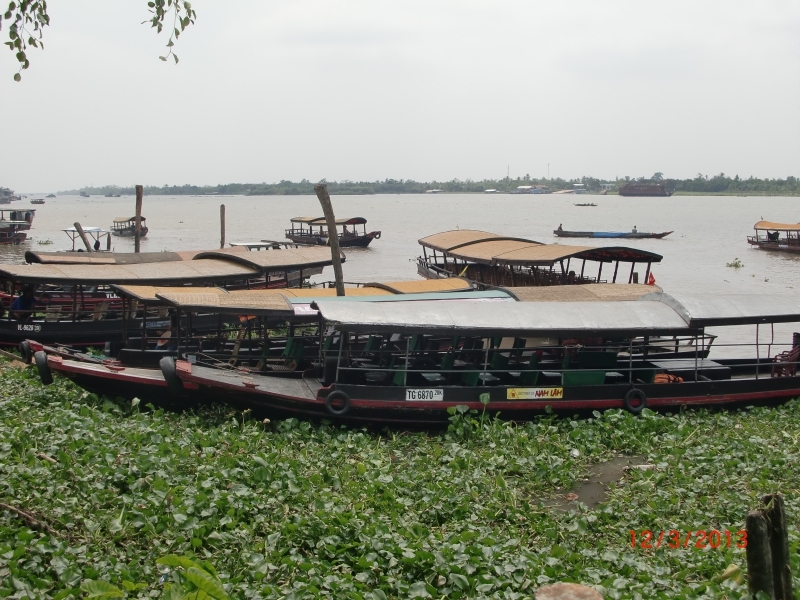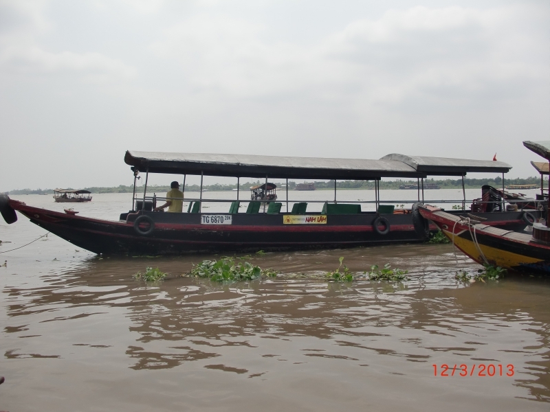 В программу этого дня входило катание в деревянных лодках (больших и маленьких) по Меконгу и его рукавам, по грязной и местами дурнопахнущей воде с осмотром быта местного населения, фабрики по производству самогона, попкорна, кокосовых конфеток. В некоторых рукавах Меконг к марту месяцу настолько обмелел, что нашу лодку с пассажирами маленькая хрупкая вьетнамка тащила волоком по жидкой грязючке.