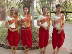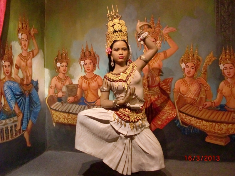 Хлеба и зрелищ нам хотелось и вечером, после заката солнца, когда измученные жарой и дневными бродилками по храмам, мы возвращались в отель и окунались в прохладную воду бассейна. Поэтому вечером мы посетили апсара-шоу, билеты на которое мы заказывали накануне на рецепшене отеля. Бронь и трансфер в одну строну – бесплатно, платишь только за ужин – 12 долларов шведский стол. Апсара –шоу начинается в 19.30 и длиться не более часа. Красивые девушки и юноши, разодетые в яркие национальные костюмы исполняют различные танцы : танец рыбаков, танец сбора риса, танец храмовых Апсар.