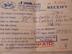 Сайгон был для нас транзитным городом. Задерживаться в нем в наши планы не входило. Нам хотелось купить экскурсию из Сайгона в Сием Риеп по дельте Меконга. Улица Pham Ngu Lao полностью состоит из гестов и турагентств. «Ассортимент» трипов и их стоимость была во всех турагентствах примерно одинаковая. Через час мы уже были счастливыми обладателями 2-х дневного трипа по дельте Меконга. Стоимость 64 доллара/человек.