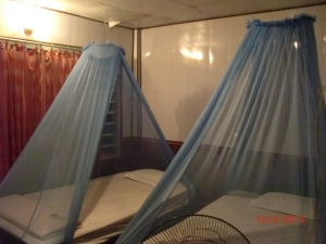 Ночевали в картонном (в буквальном смысле этого слова) гесте, который стоит на сваях прям на реке Меконг. Очень пригодился фумигатор от комаров и бируши. Если бы не эти «девайсы», то ловля комаров и прослушивание сопения (даже не храпа!) соседей по гесту бодрил бы всю ночь.