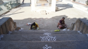 Храм и территория вокруг него такие же благостные, как и вся Щраванабелагола. Перед входом женщины рисуют ранголи, мягкие красивые тени подрабатывают то, с чем не справился человек и смягчают некоторую угловатость храма.