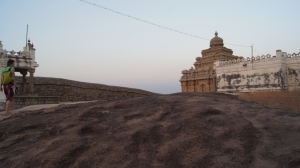 Монастырь стоит на такой неровной поверхности, которую древние даже не пытались выровнять. Взяли и построили свои басти на округлой вершине, покрытой скальными потеками, на которых на древних языках выбиты надписи. Эти надписи есть и на санскрите, и на древнем каннада, и на древнем телугу. Они помогли ученым многое узнать о династии Ганга, правящей в этих краях, и их сейчас тщательно оберегают.