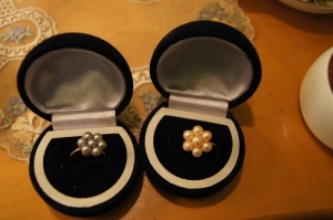 Вот мой белый жемчуг не на мне, а на бархате. Жемчужина - капля, огромная, с мелкими крапинками, которые отличуют реальную крупную жемчужину от поддельной, и серьги с двумя круглыми жемчужинами и одной - в форме капли. Если вы хотите купить каплю - говорите - drop. И еще прикладываю фотографию пары колечек с жемчугом: серым и розовым, приобретенным в подарок племянницам. Эти колечки с изменяющимся размером, что очень удобно