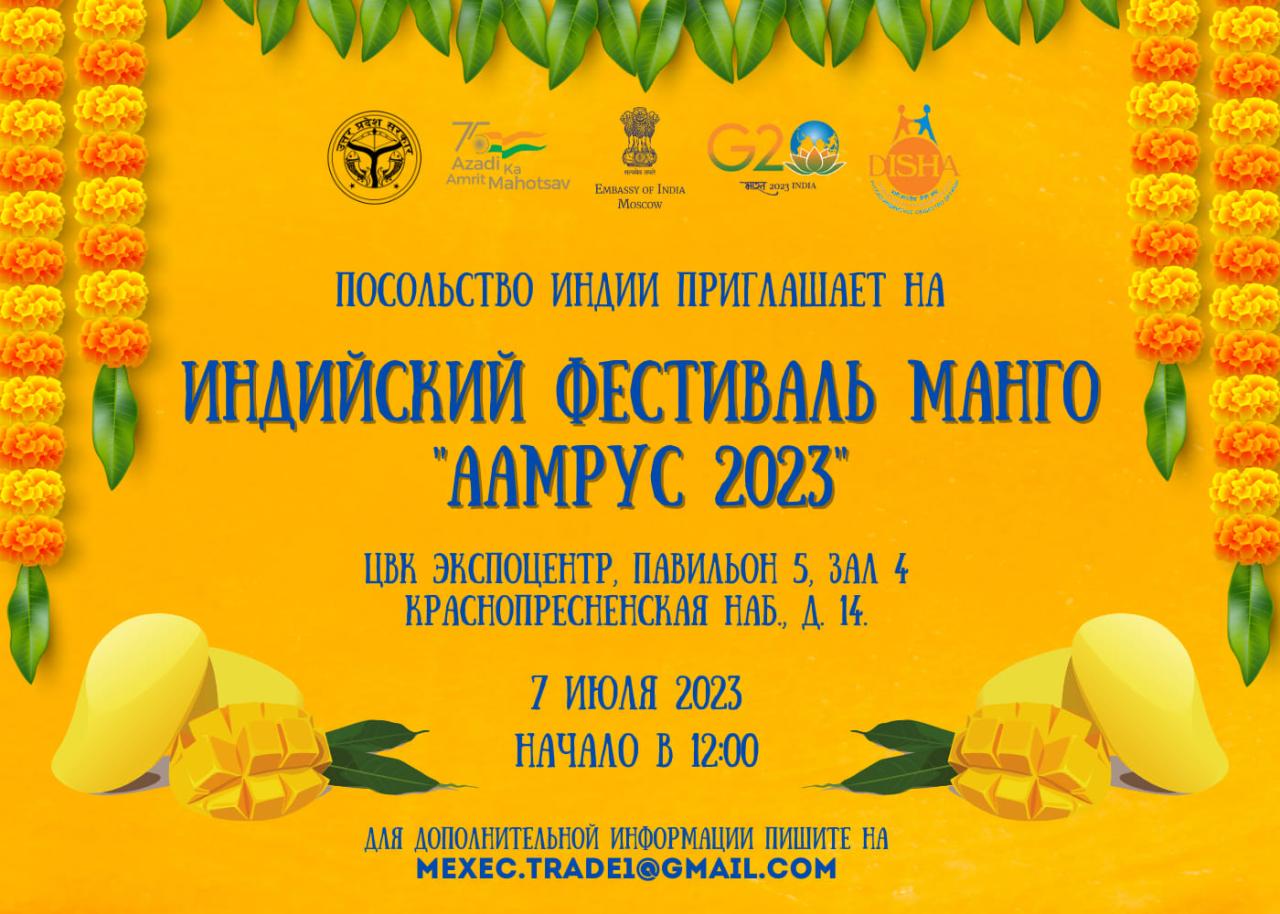 Посольство Индии в Москве приглашает вас посетить Индийский манго фестиваль «Аамрус 2023», где вы сможете попробовать различные виды этого невероятного фрукта.