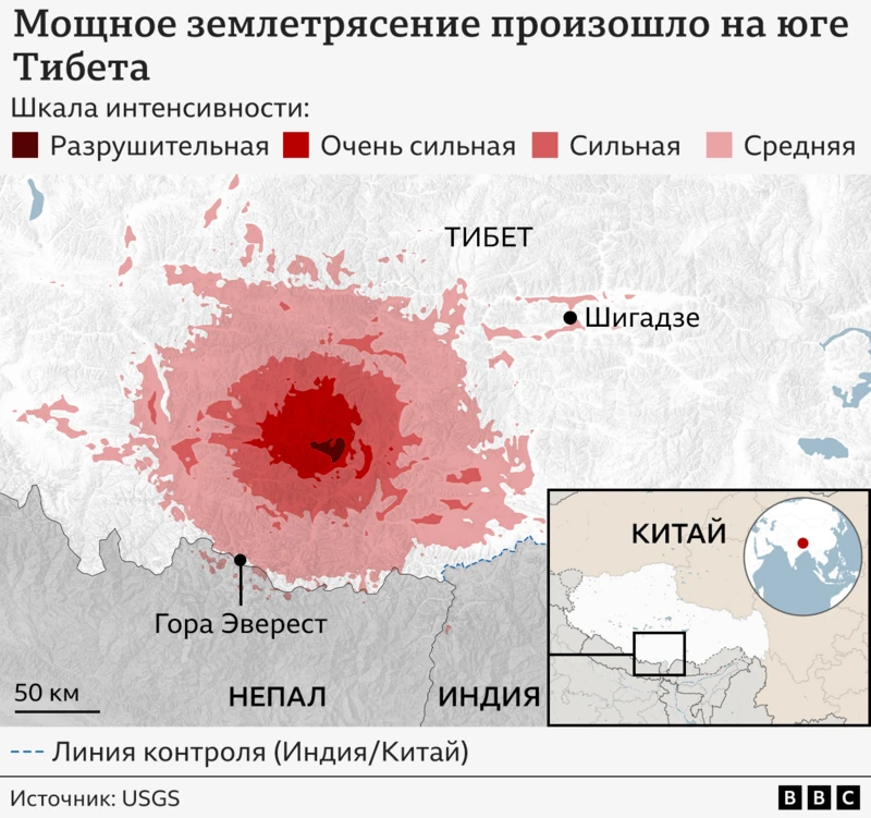 Геологическая служба США (USGC) сообщила о землетрясении магнитудой 7,1 в 177 км к юго-западу от города Шигацзе, который считается одним из самых священных городов Тибета.